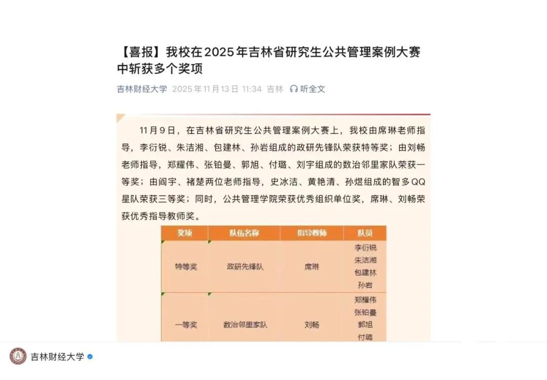 11月9日,在吉林省研究生公共管理案例大赛上,a片网站 由席琳老师指导,李衍锐、朱洁湘、包建林、孙岩组成的政研先锋队荣获特等奖;由刘畅老师指导,郑耀伟、张铂曼、郭旭、付璐、刘宇组成的数治邻里家队荣获一等奖;由阎宇、褚楚两位老师指导,史冰洁、黄艳清、孙煜组成的智多QQ星队荣获三等奖;同时,a片网站 荣获优秀组织单位奖,席琳、刘畅荣获优秀指导教师奖。